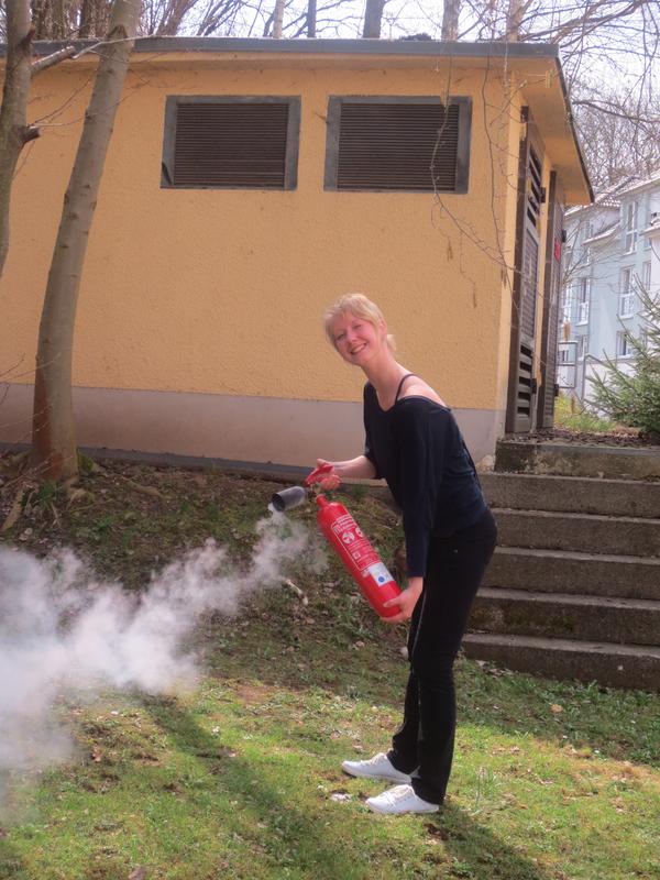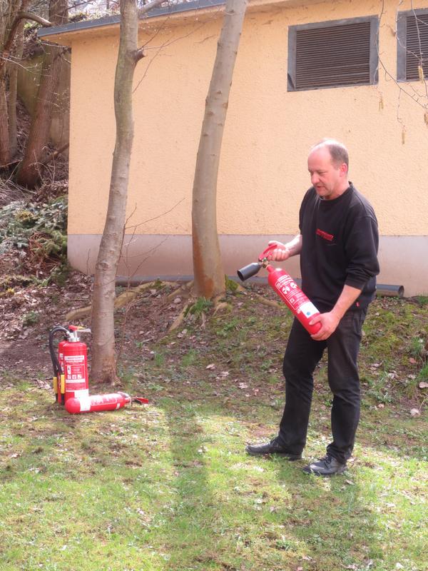 Herr Hübel vom Brandschutz aus Chemnitz erklärte den Mitarbeitern des Seniorenpflegeheims „An der Burgstädter Straße“ den Umgang mit den Feuerlöschern. Dazu gehörte auch der praktische Einsatz von Feuerlöschgeräten.